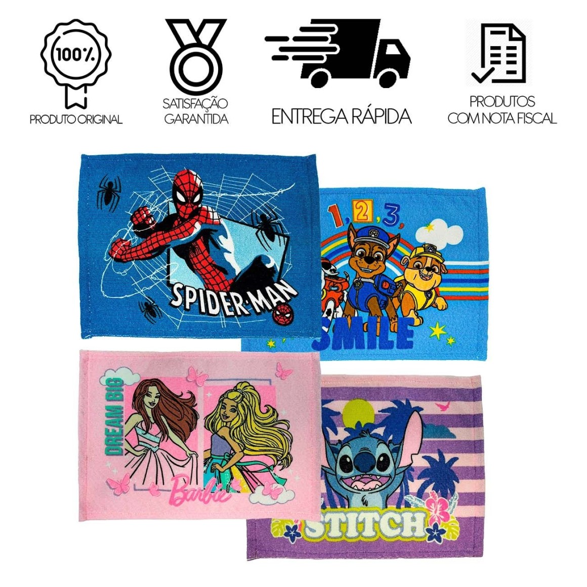 Spider Man, Patrulha Canina, Barbie e Stitch